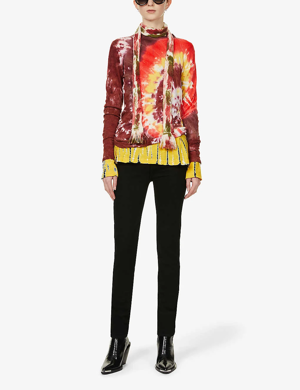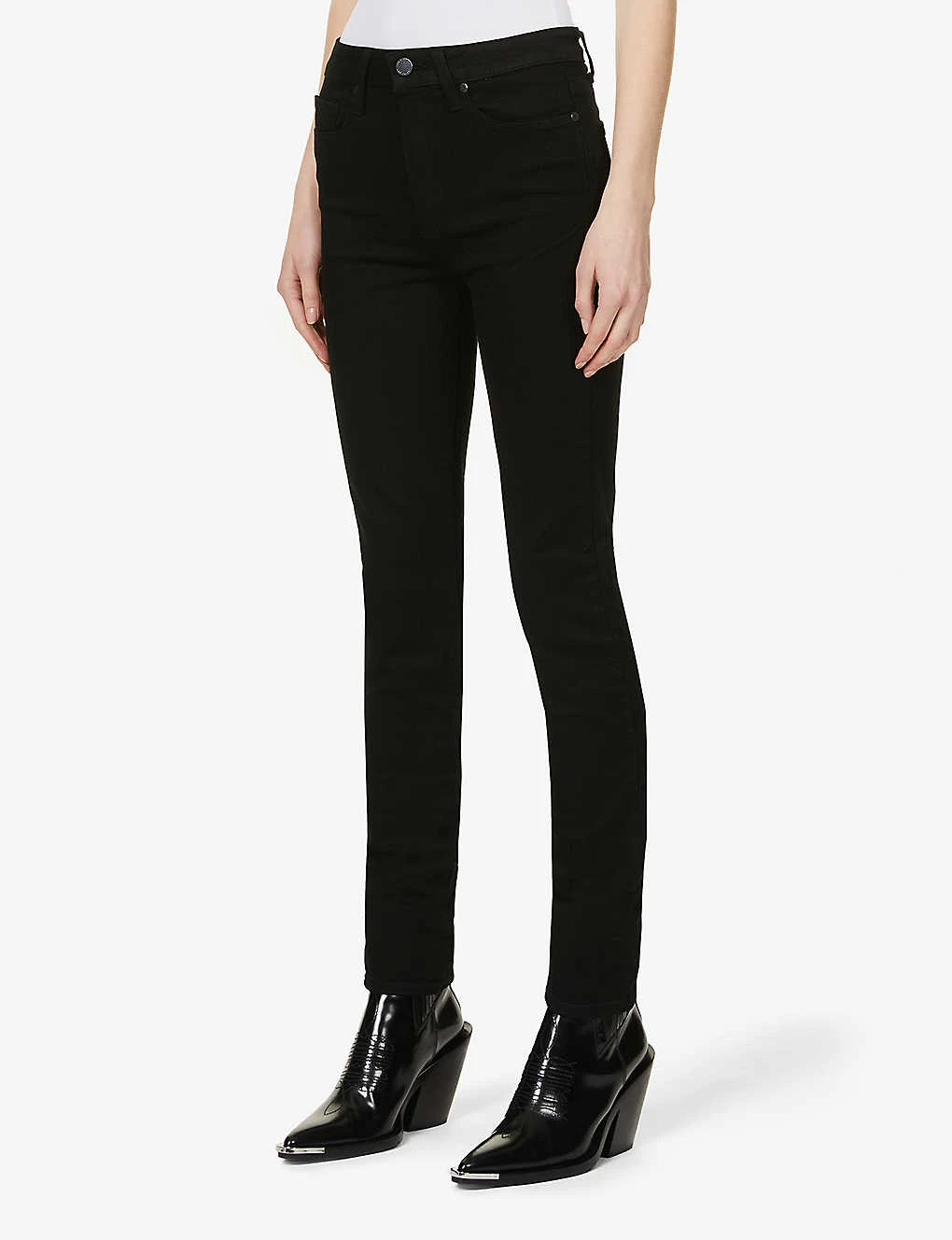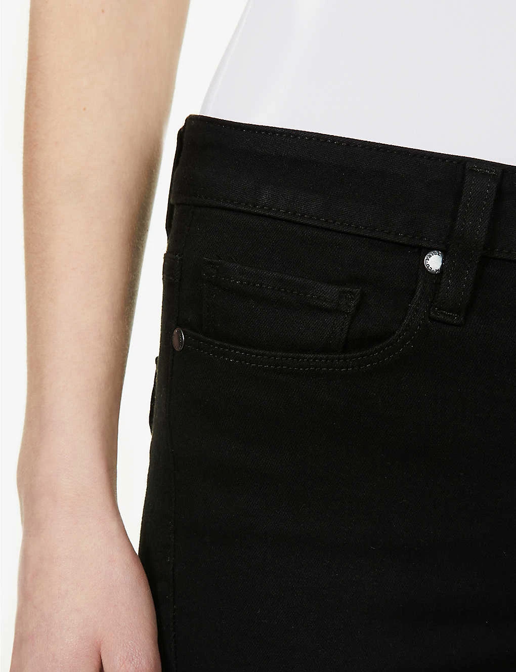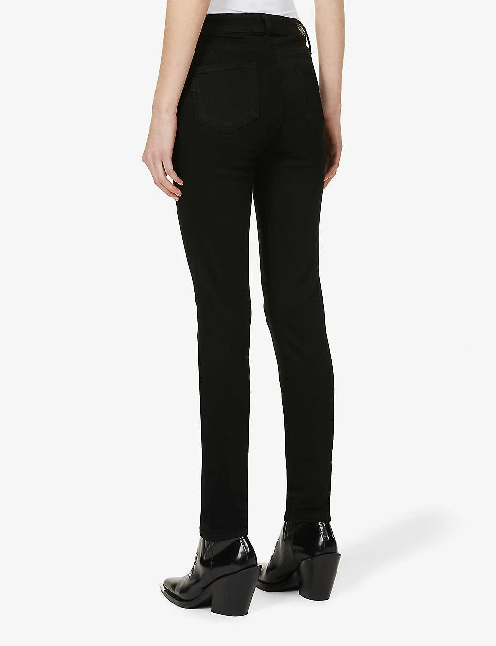 - Skinny, mid-rise, belt loops, five pockets, branded hardware, V-shaped yoke, branded leather patch at back