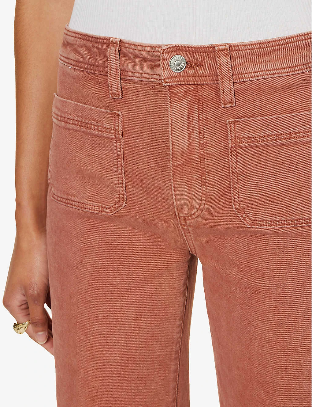 - Exposed button and concealed zip-fly fastening at front
