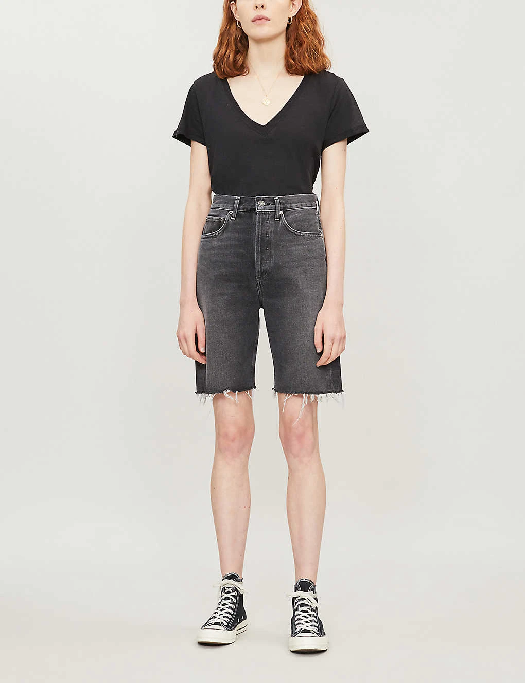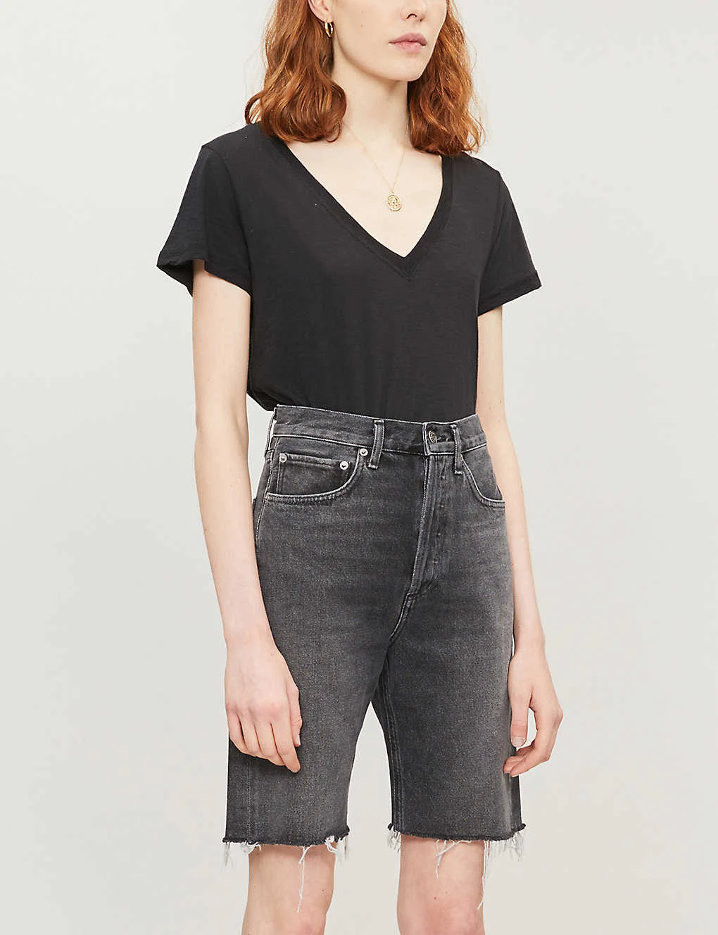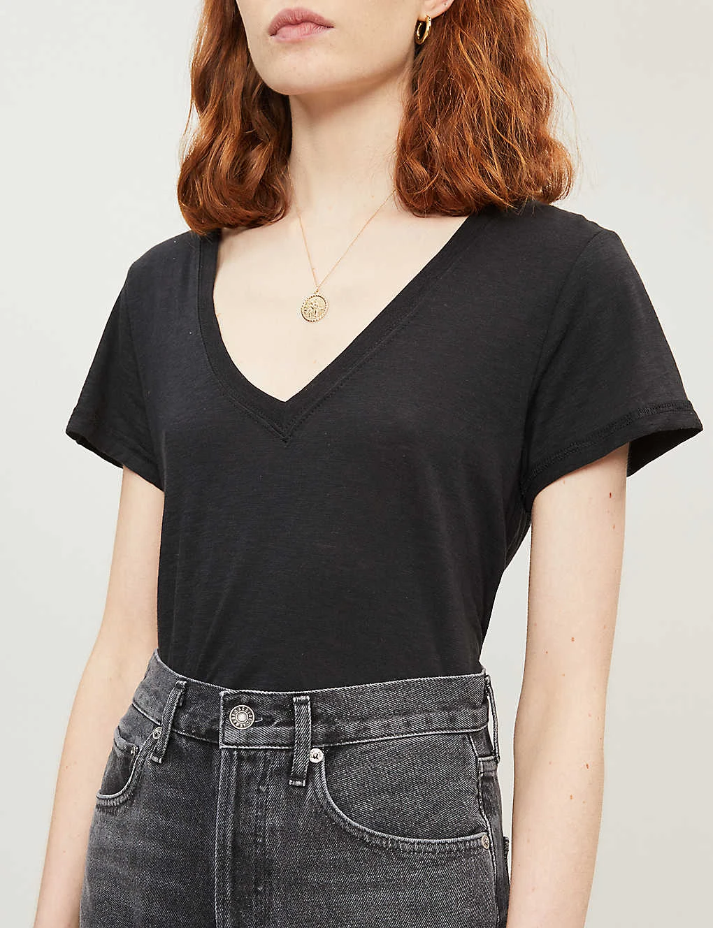 Paige cotton and modal-blend T-shirt Slips on V-neck, short sleeves, branded stitching at side seam, ribbed trims, straight hem 60% cotton, 40% modal Machine wash True to size Size small: length 22″” Model is 5ft 10.5″” and wears a size small