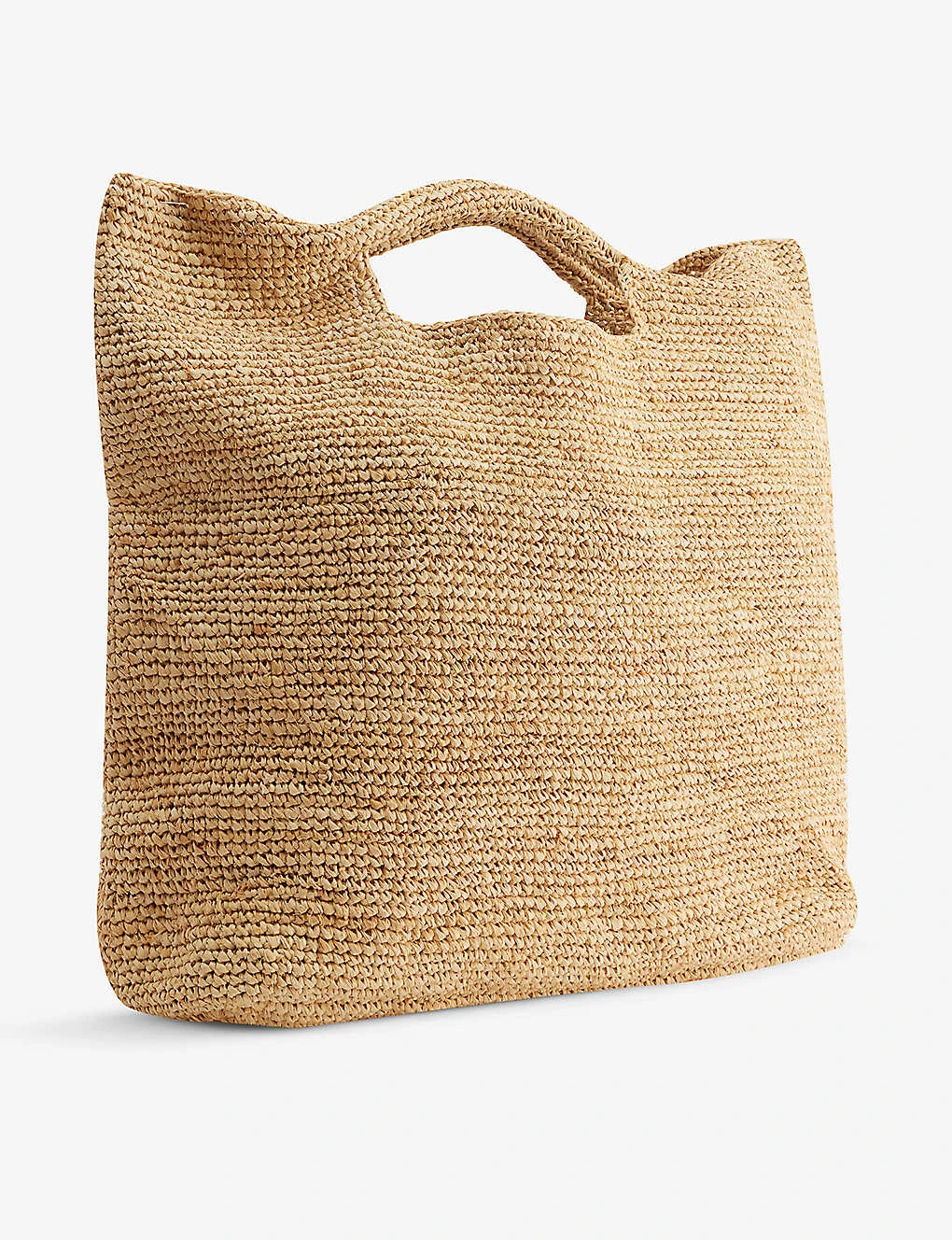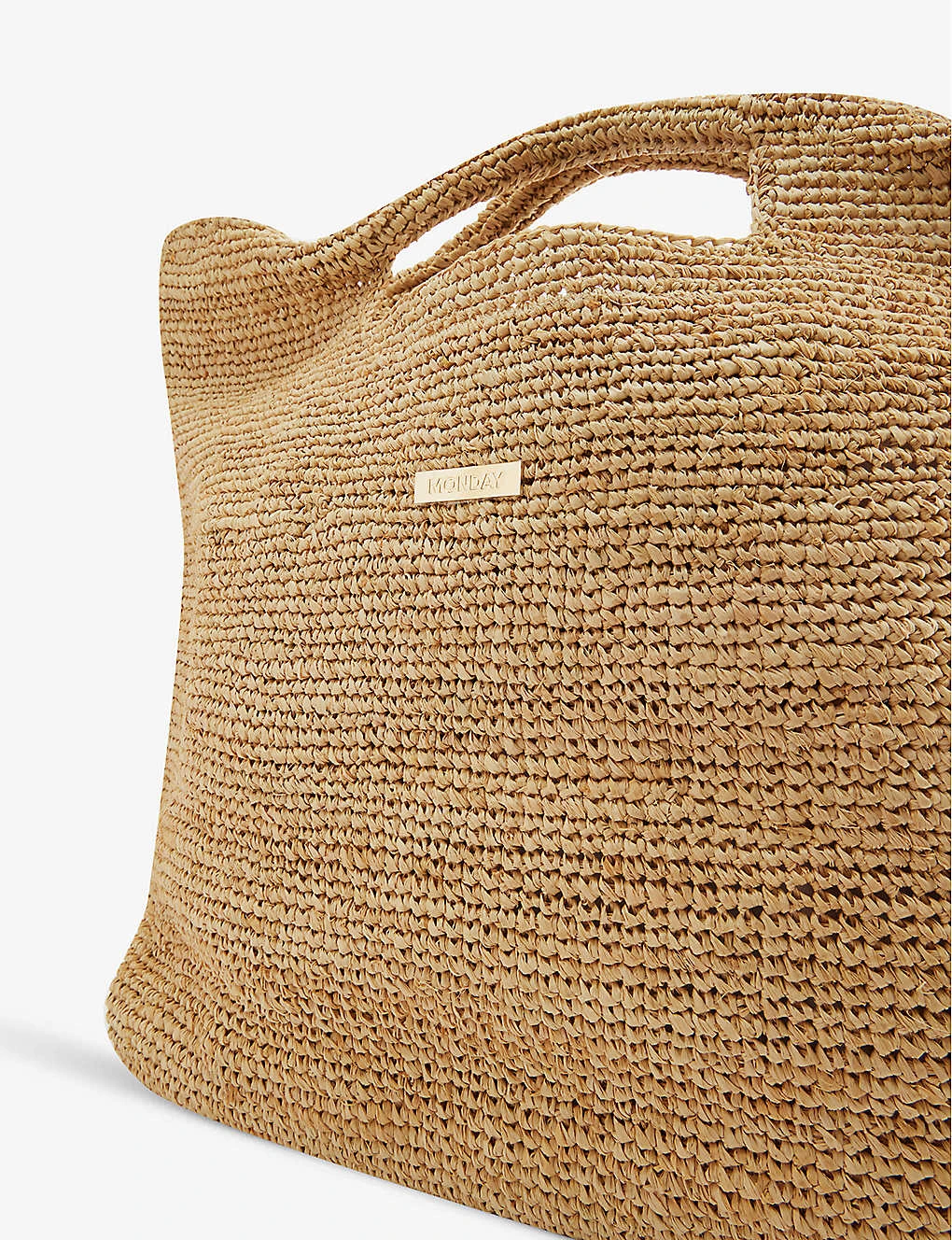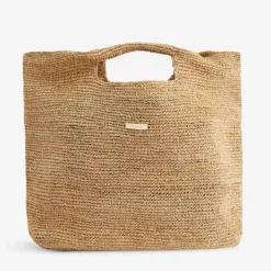 - Rectangular shape, double top handles, gold-toned brand plaque at front, all over raffia texture, one main compartment, internal slip pocket, fully lined