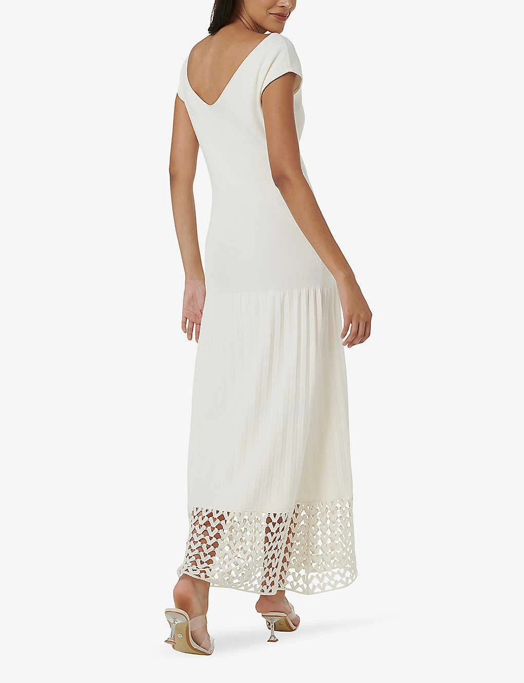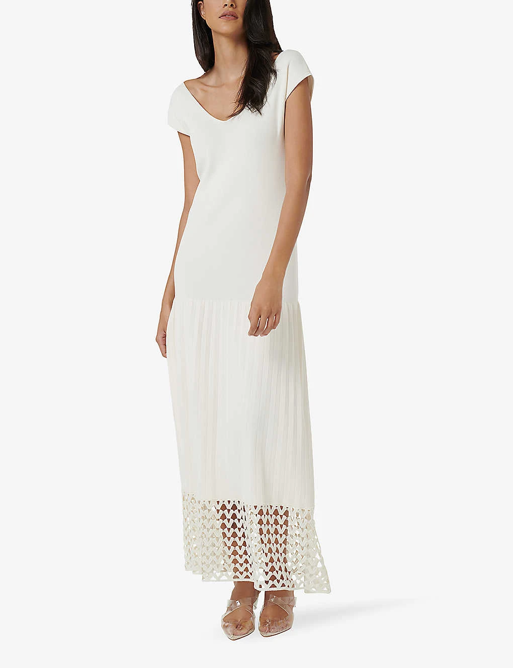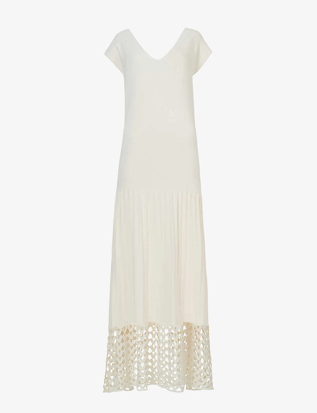 - Slim fit, short sleeves, V neck, maxi length, knitted construction, pleated skirt, open crochet hem panel, V back