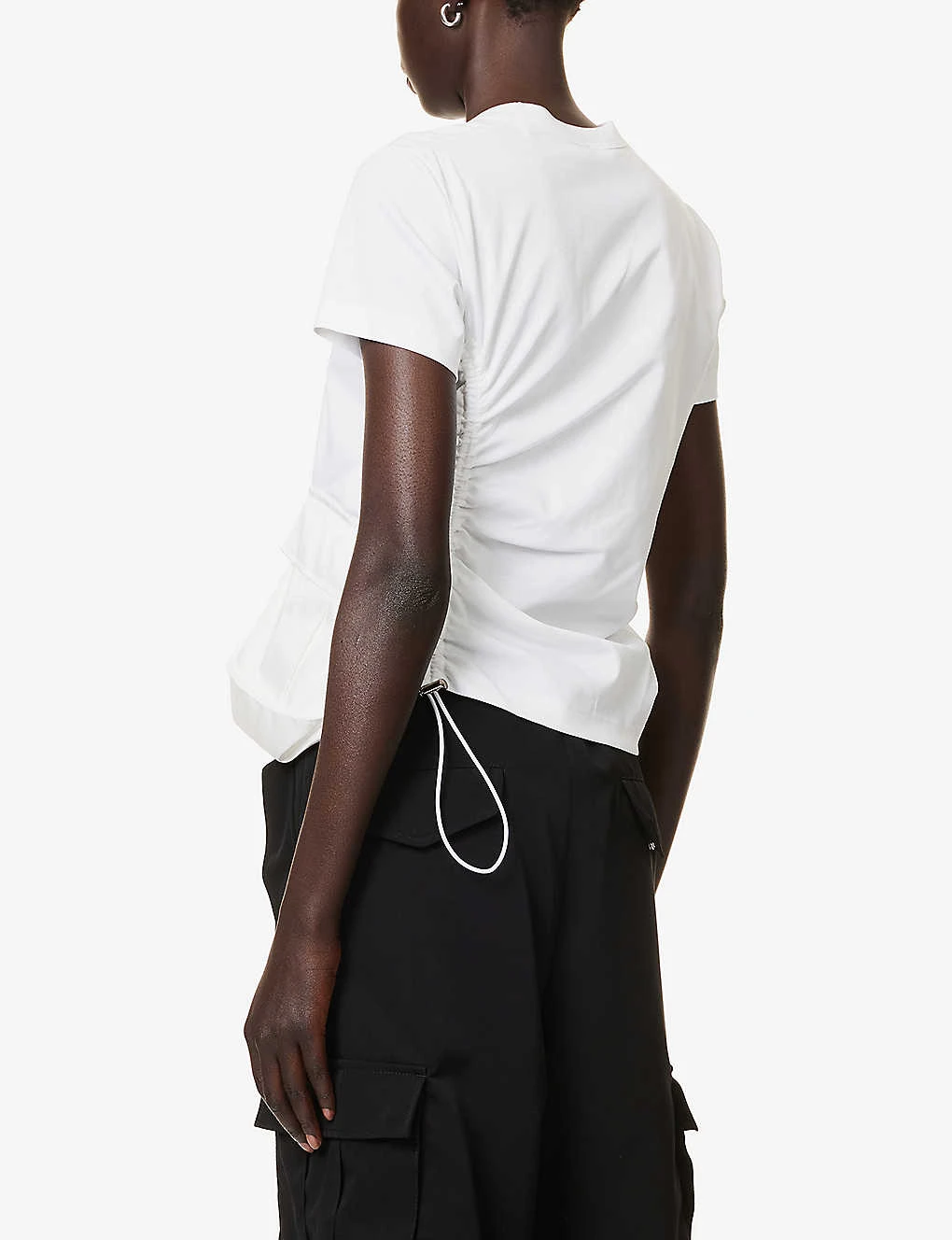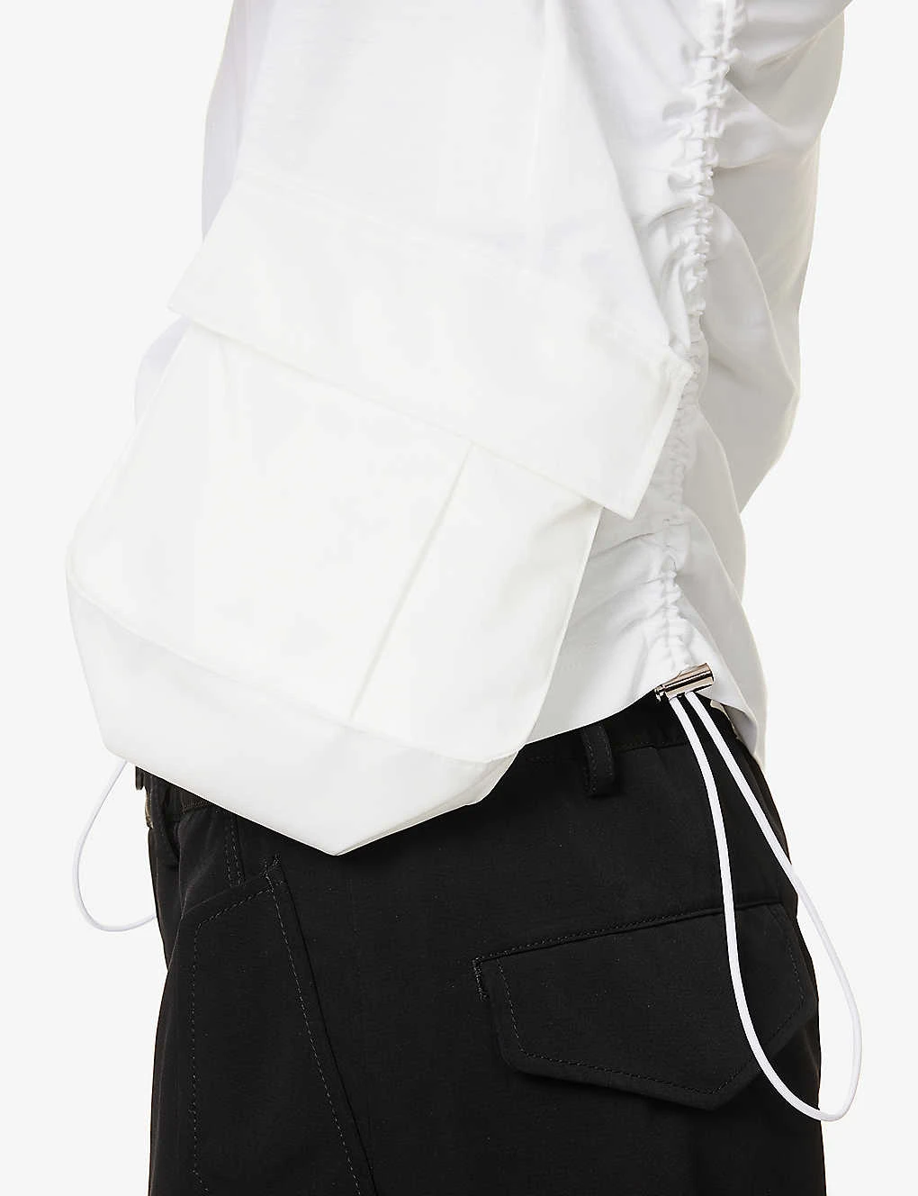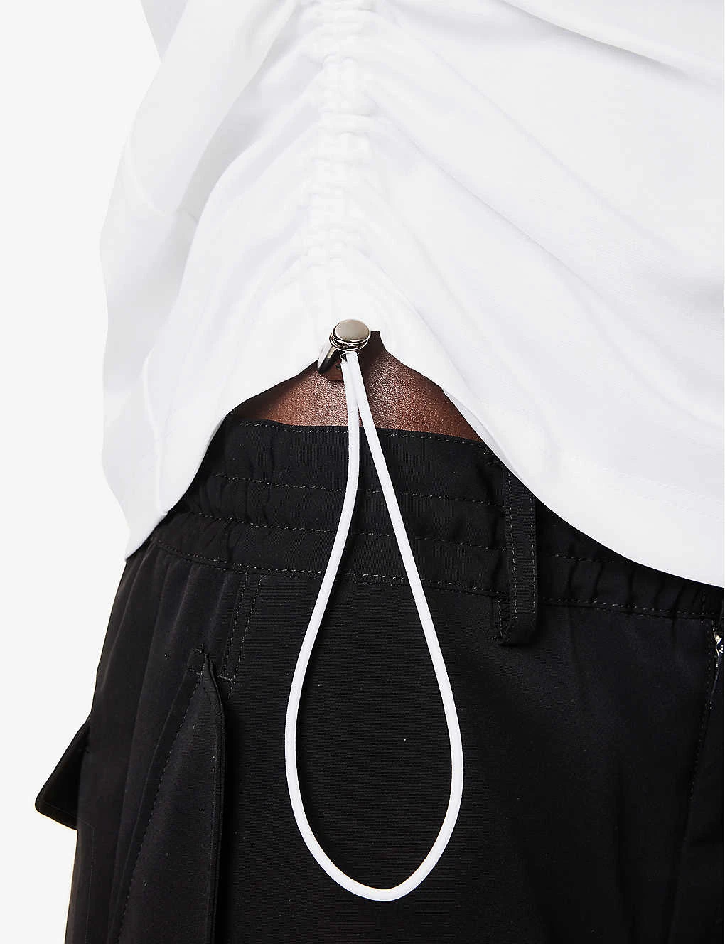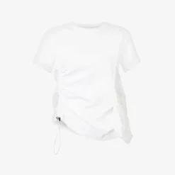 - Regular-fit, scoop neck, ribbed trim at neck, short sleeves, ruching at front, satin flap pocket at front, drawstring-toggle at side, silver-toned hardware