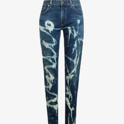 - Slim-fit, high-rise, skinny, belt loops, five pockets, branded hardware, all-over bleached dye print, debossed brand patch at back, V-shaped yoke at back, partially lined, embroidered brand tab at back