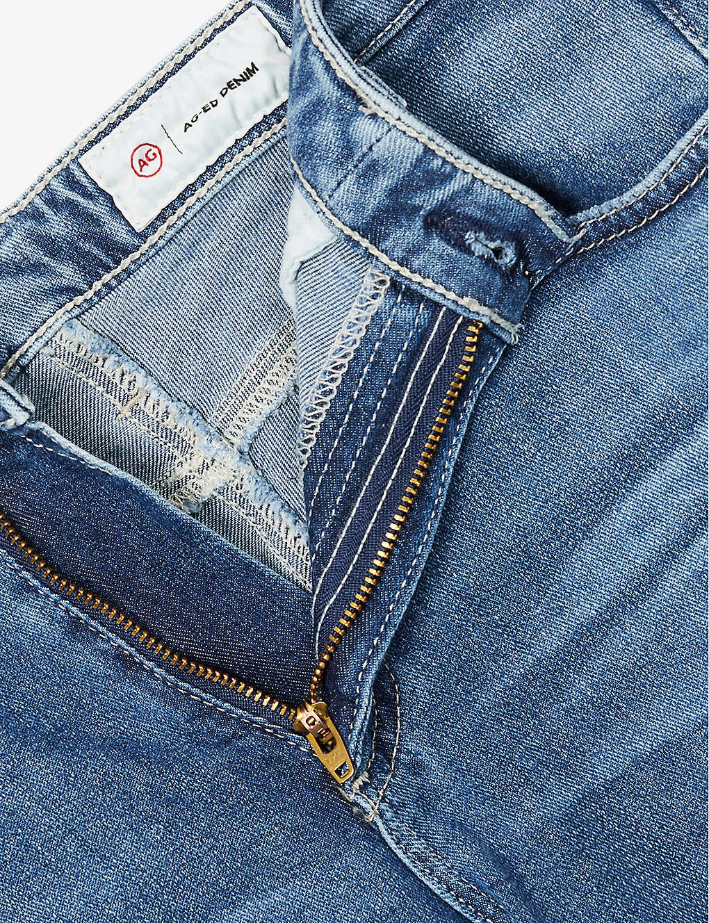 - Regular-fit, high-rise, skinny, belt loops, five pockets, branded hardware, all-over faded wash and whiskering, V-shaped yoke at back, embroidered brand patch at back, contrast embroidery at back, partially lined, cropped
