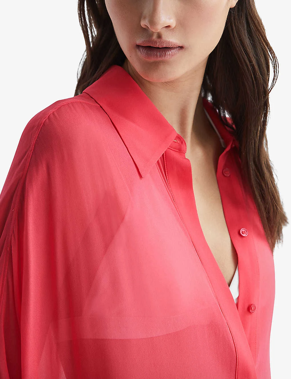 - Relaxed fit, collar, three-quarter-length sleeves, buttoned cuffs, split hems, sheer finish