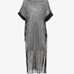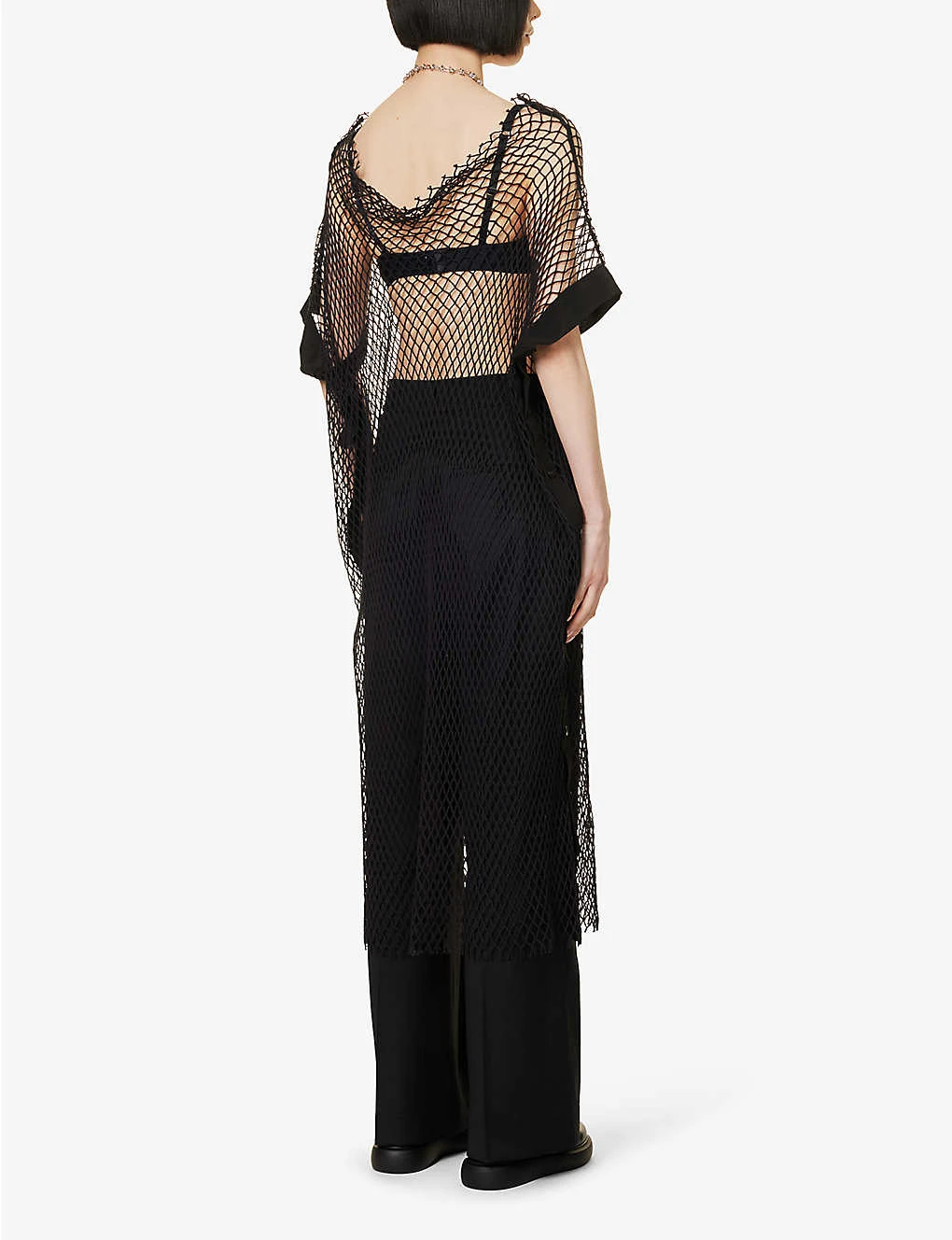 - Relaxed fit, cowl neckline, sleeveless, all-over net, button fastenings at sides, raw hem