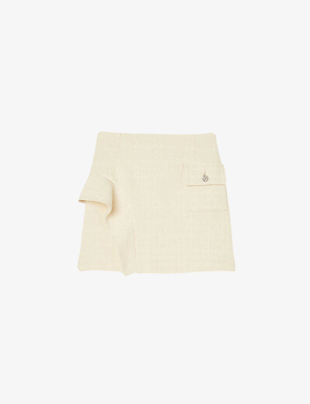 - Mid-rise, pocket at the front, jewel button at front, ruffle at the side, tweed finish