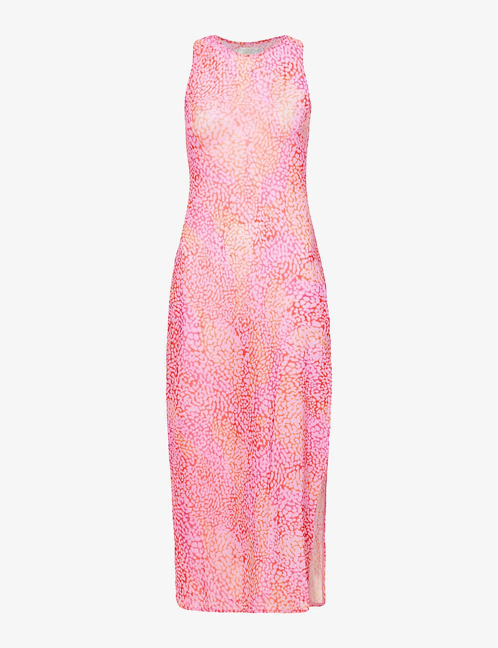 - Slim fit, scoop neck, sleeveless, semi-sheer, all-over graphic pattern, split hem at side
