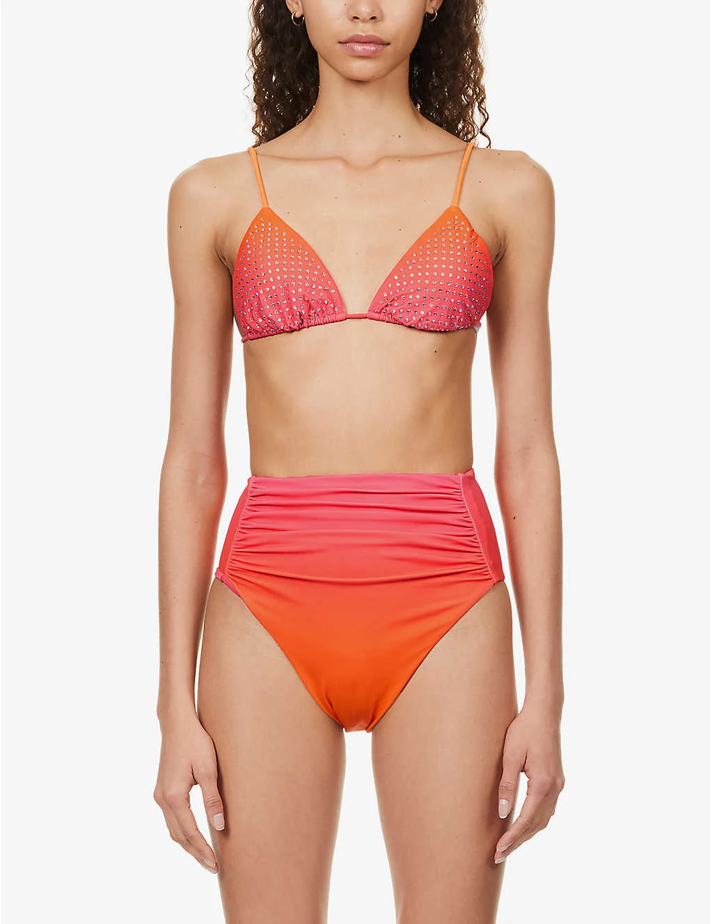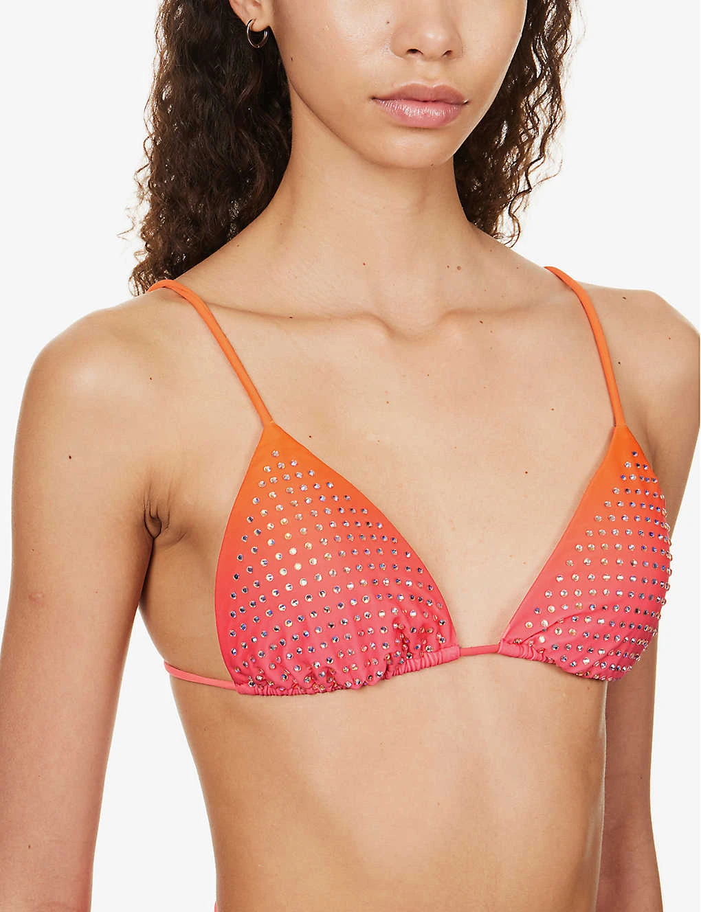 - Triangle cups, halterneck straps, padded, removable pads, all-over crystal embellishment, open strappy back, gold-toned hardware