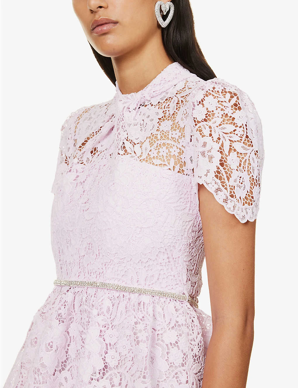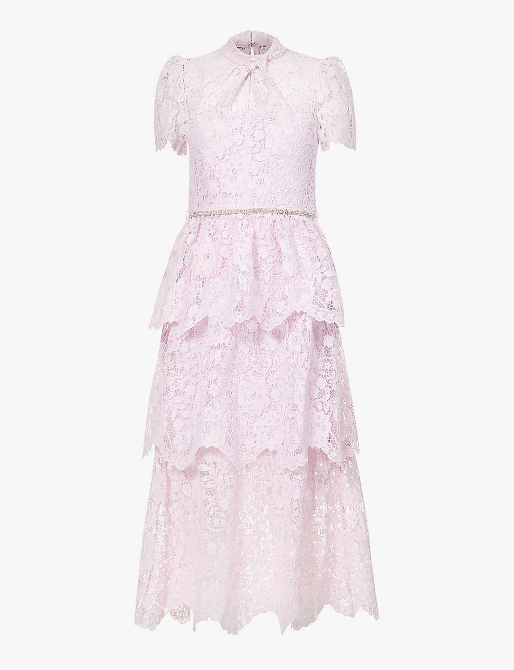 - Regular fit, high neck, twist design at neck, short sleeves, belt loops with detachable belt, keyhole at back, floral lace pattern, tiered flared hem