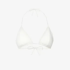 - Halter neck, V-neck, soft triangle cups, open back, tonal stitching