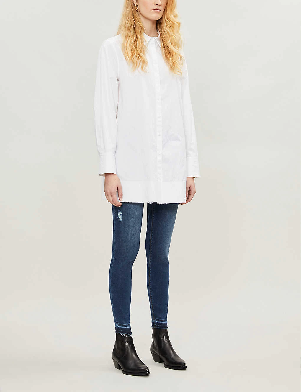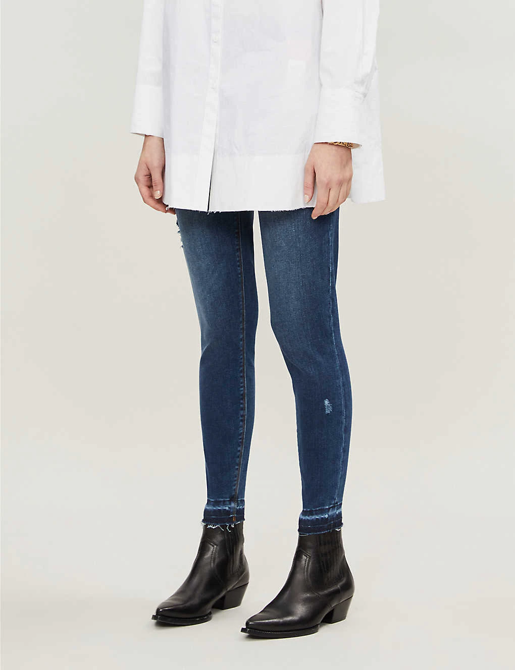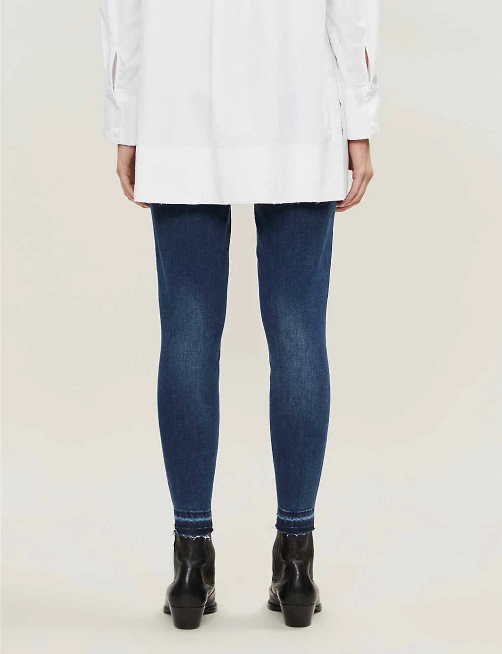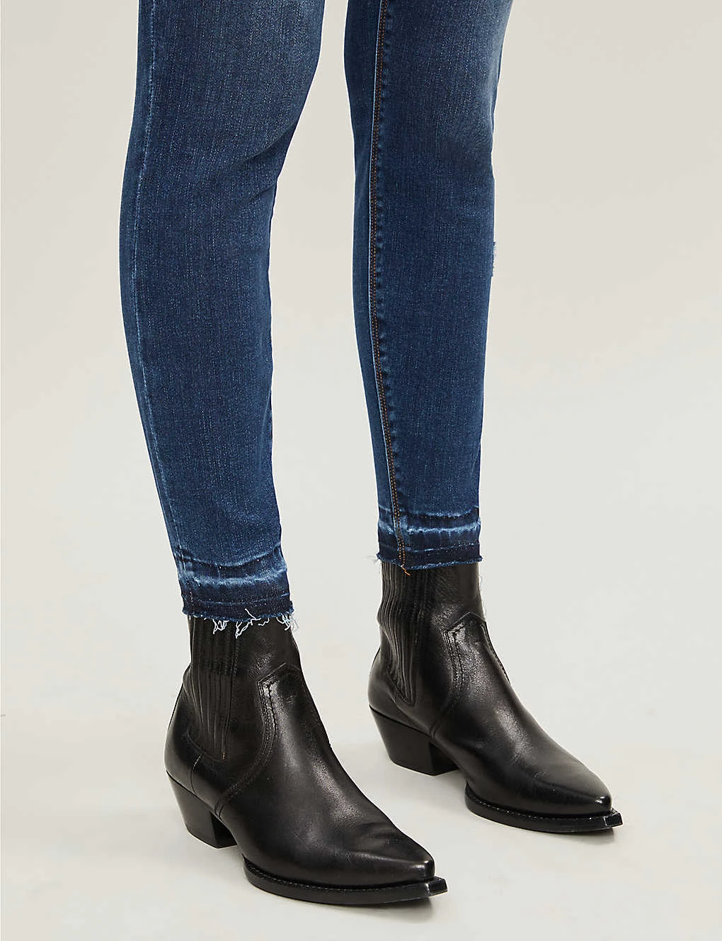 - High rise, skinny, two patch pockets at back, contrasting stitching, faded wash and whiskering, v-shaped yoke at back, frayed hem