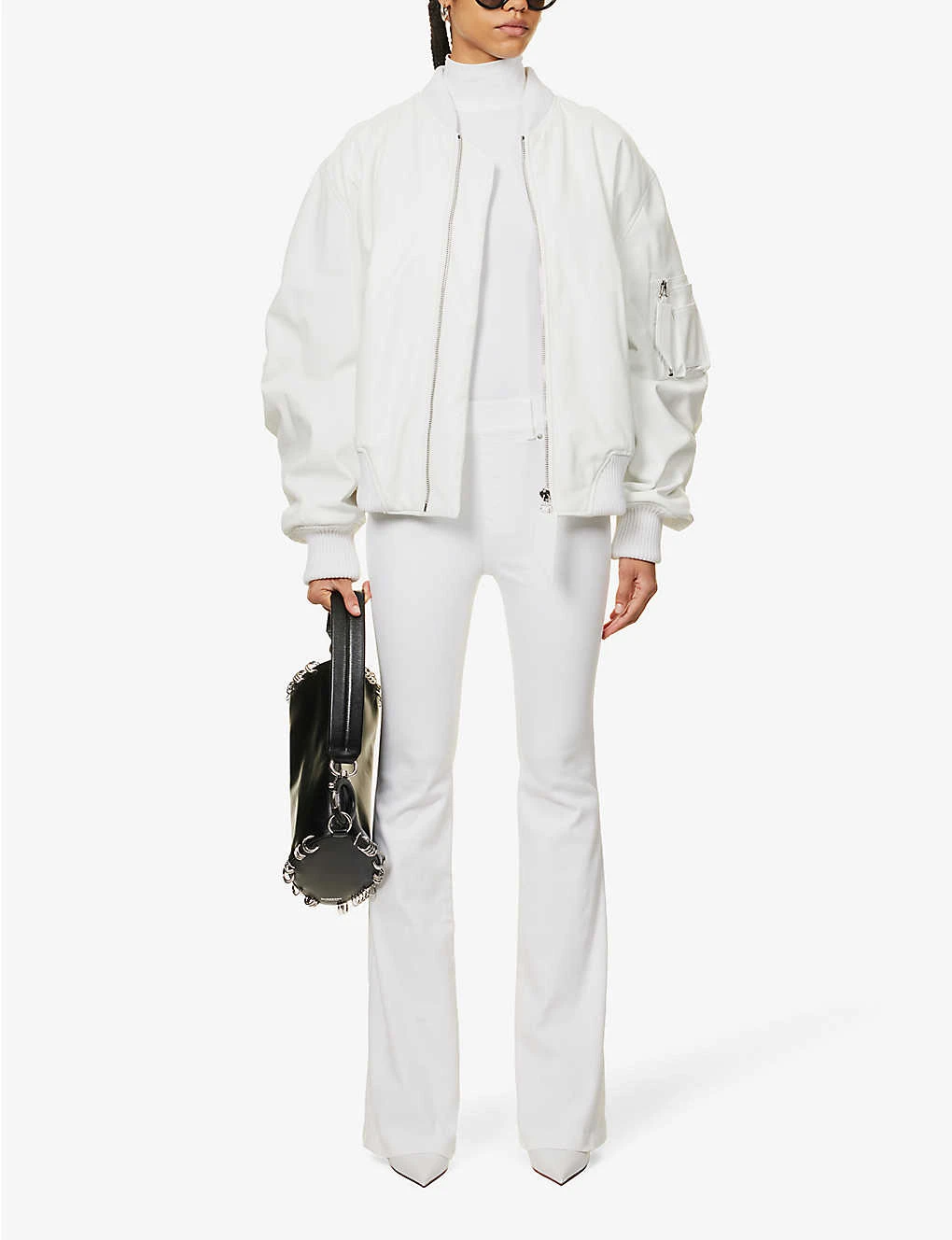 - Regular fit, high waist, faux pockets at front, belt loops, two patch pockets at back, flared leg, silver toned hardware