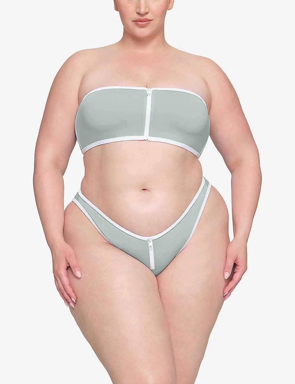 - Fitted, high rise, dipped waist, contrast trims, contrasting zip down front, high leg