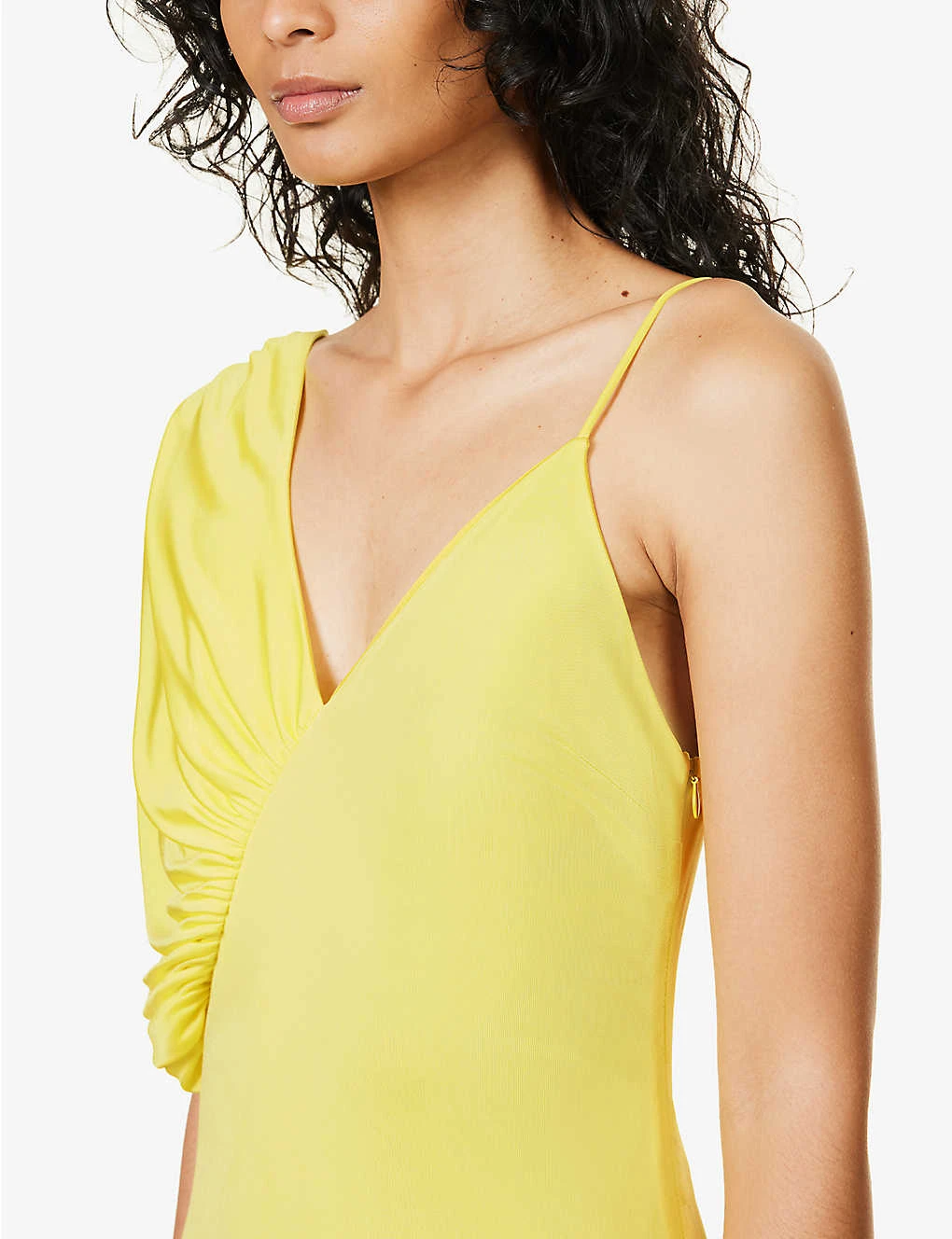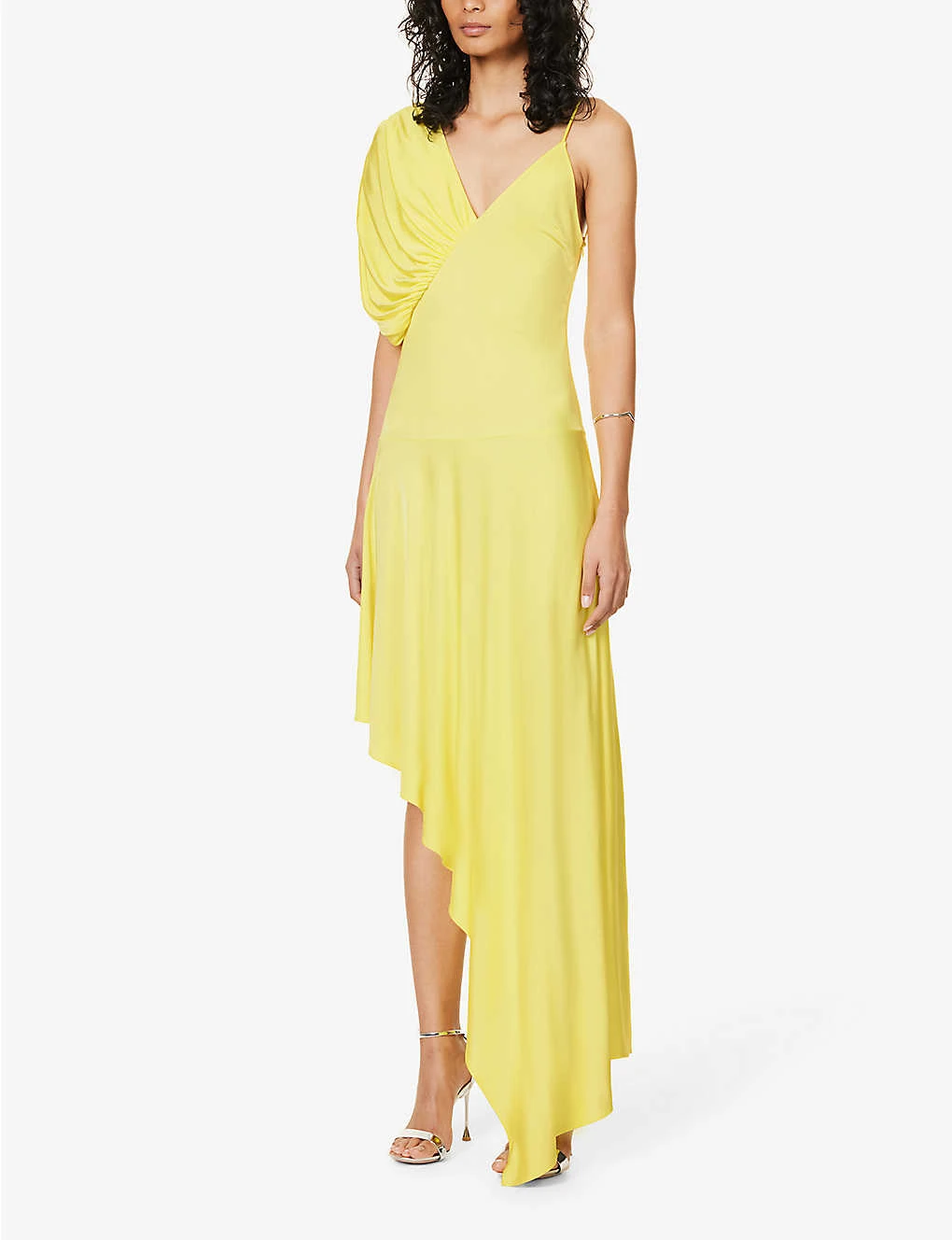 - Regular fit, asymmetric neckline, one ruched shoulder, one ruffled short sleeve, asymmetric hem