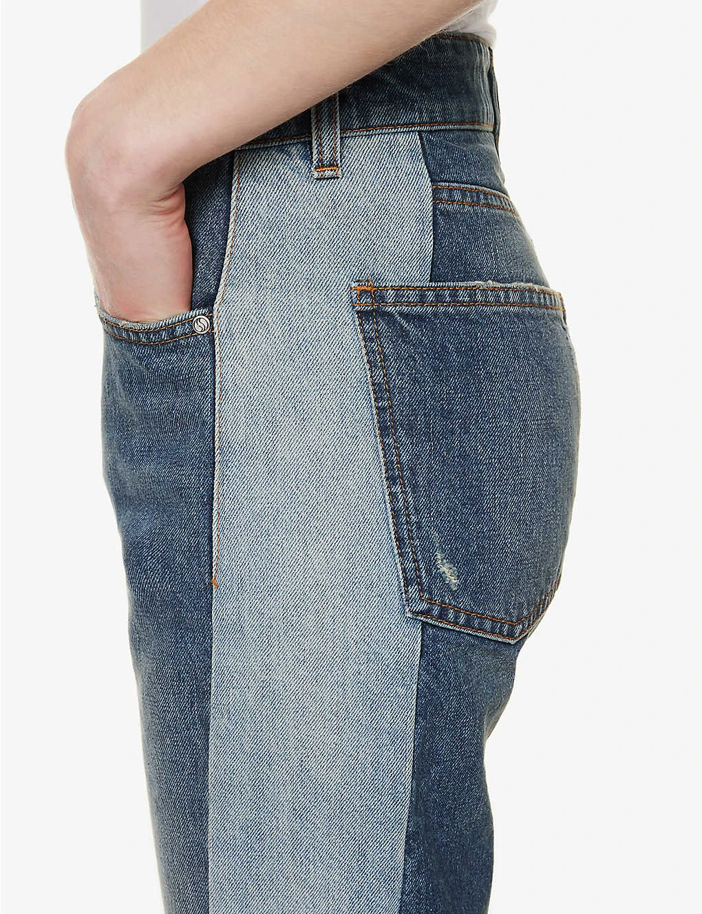 - Exposed button and concealed zip-fly fastenings at front