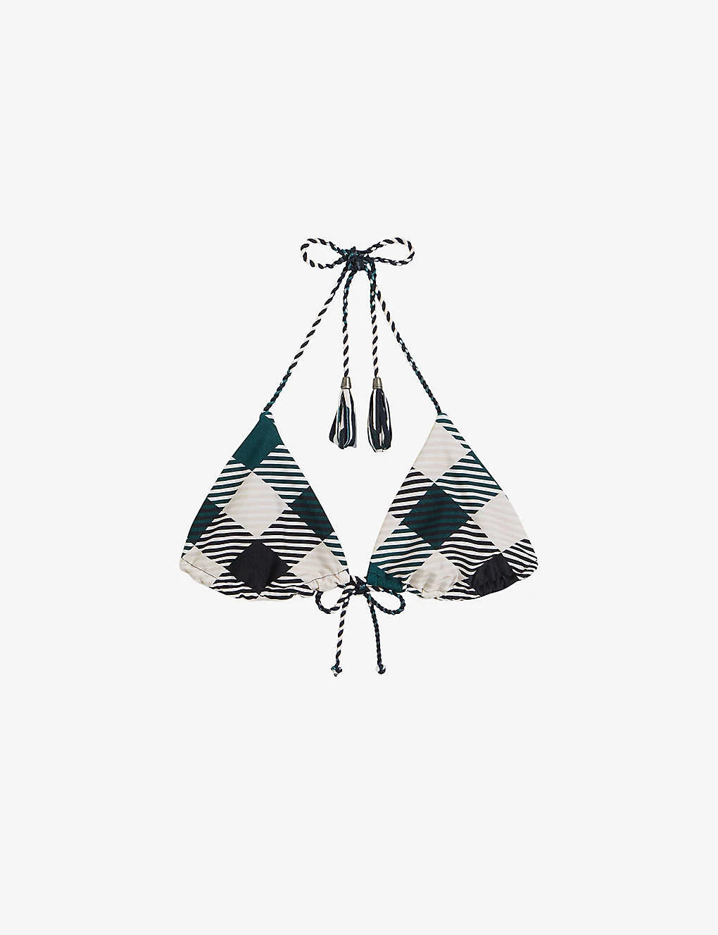 - Branded self-tie tassels at top, triangle shaped cups, self-tie fastening at bottom, all-over checked print, reversible design, fully lined
