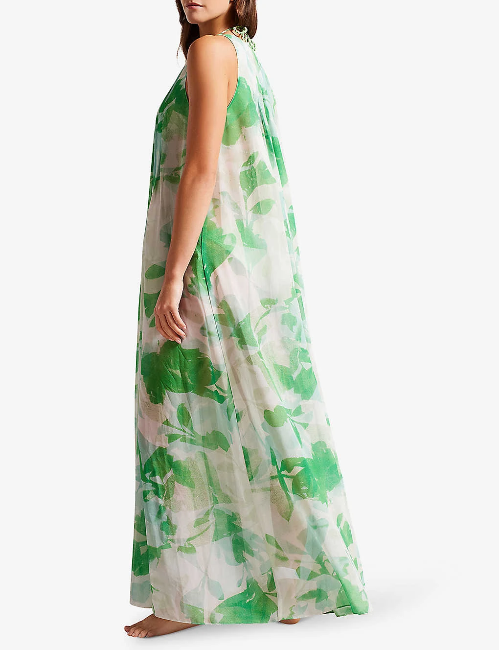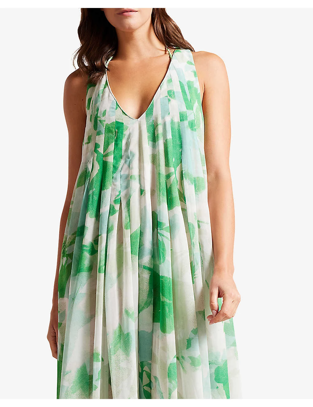 - Plunge neckline, sleeveless, abstract-print throughout, floaty silhouette, maxi length
