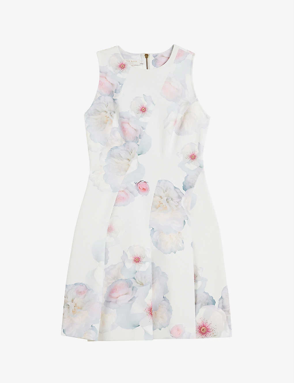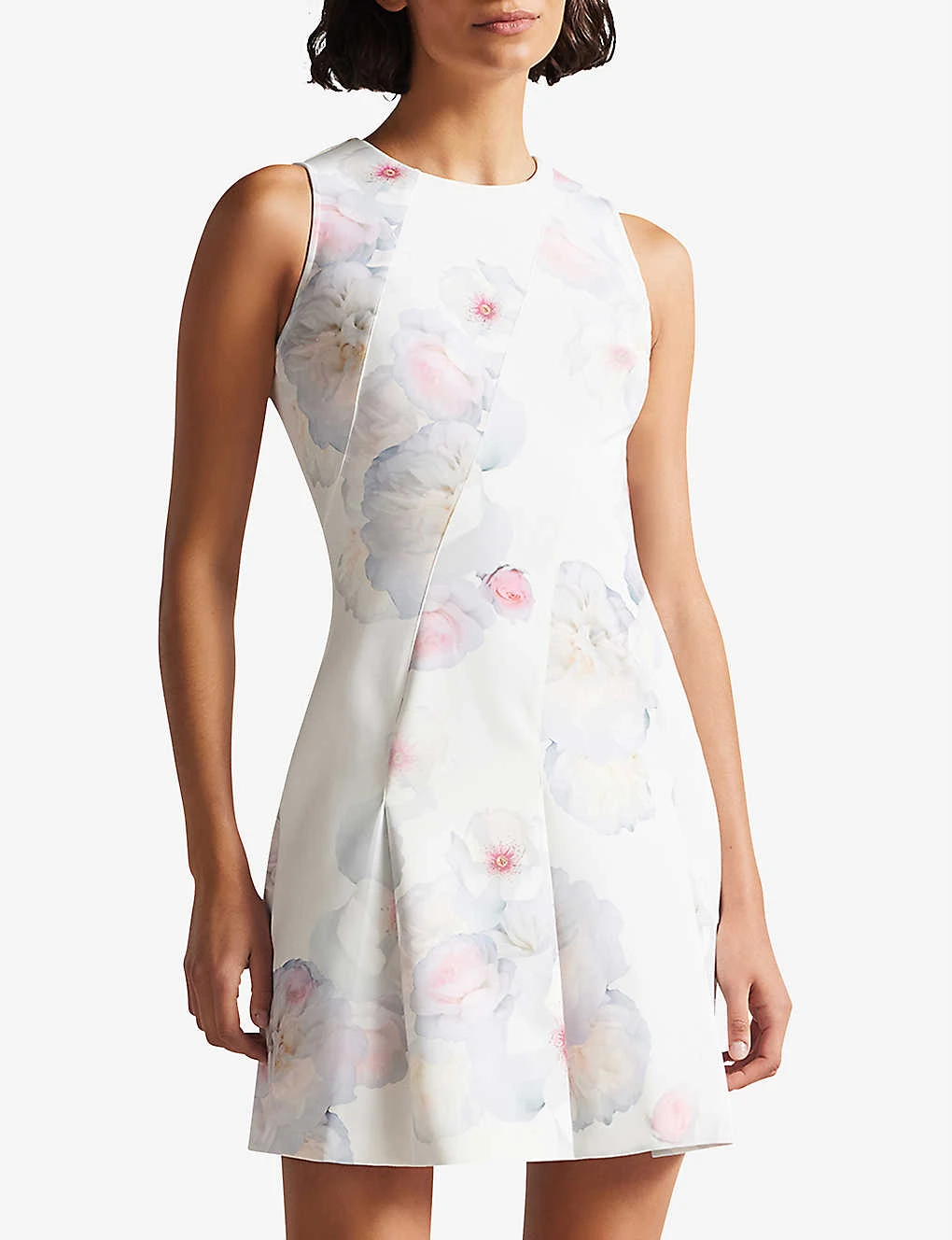 - Round neck, sleeveless, gathered waist, all-over floral print, pleated skirt, mini length