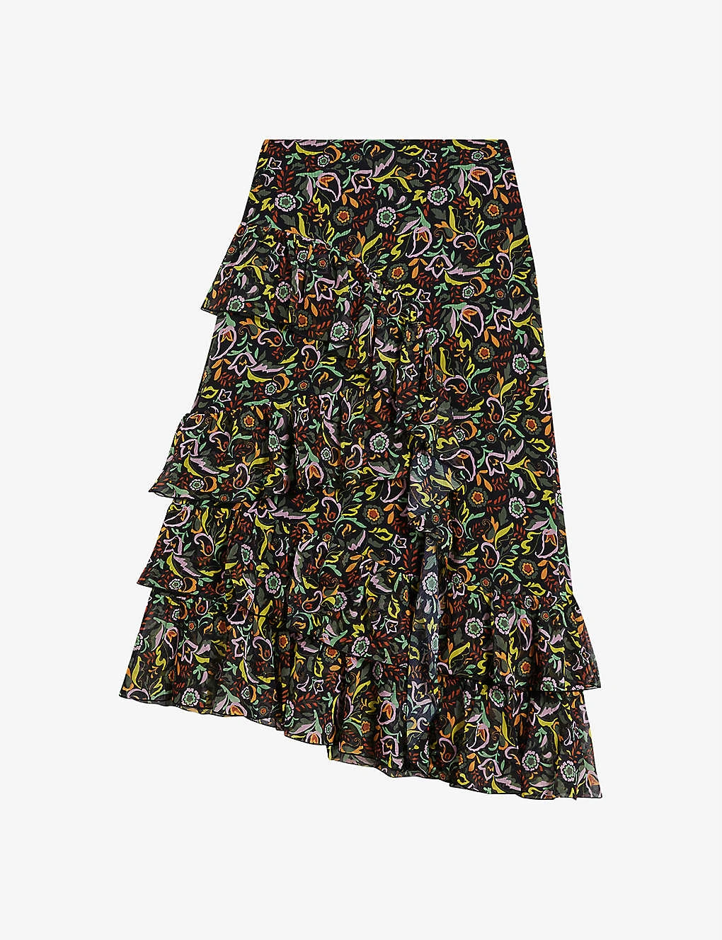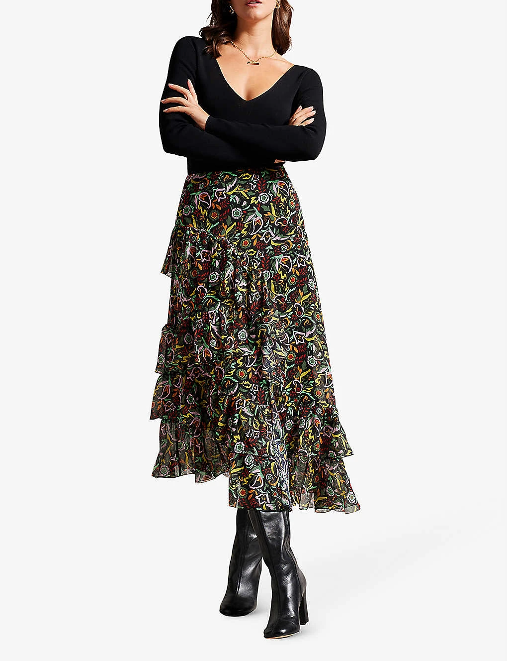 - High-rise, midi, all-over floral pattern, tiered, frilled, asymmetric