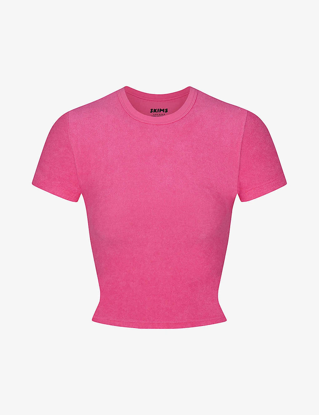 - Fitted, round neck, all-over terry texture, ribbed trim at neck, short sleeves, cropped hem