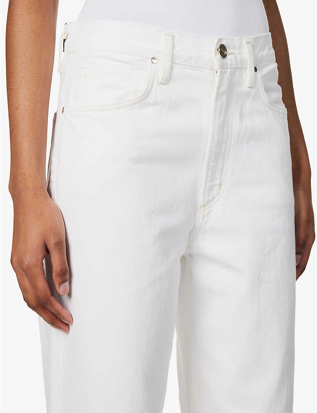 - Regular-fit, high-rise, wide leg, belt loops, branded gold-toned hardware, five pockets, debossed brand patch at back, V-shaped yoke at back, partially lined