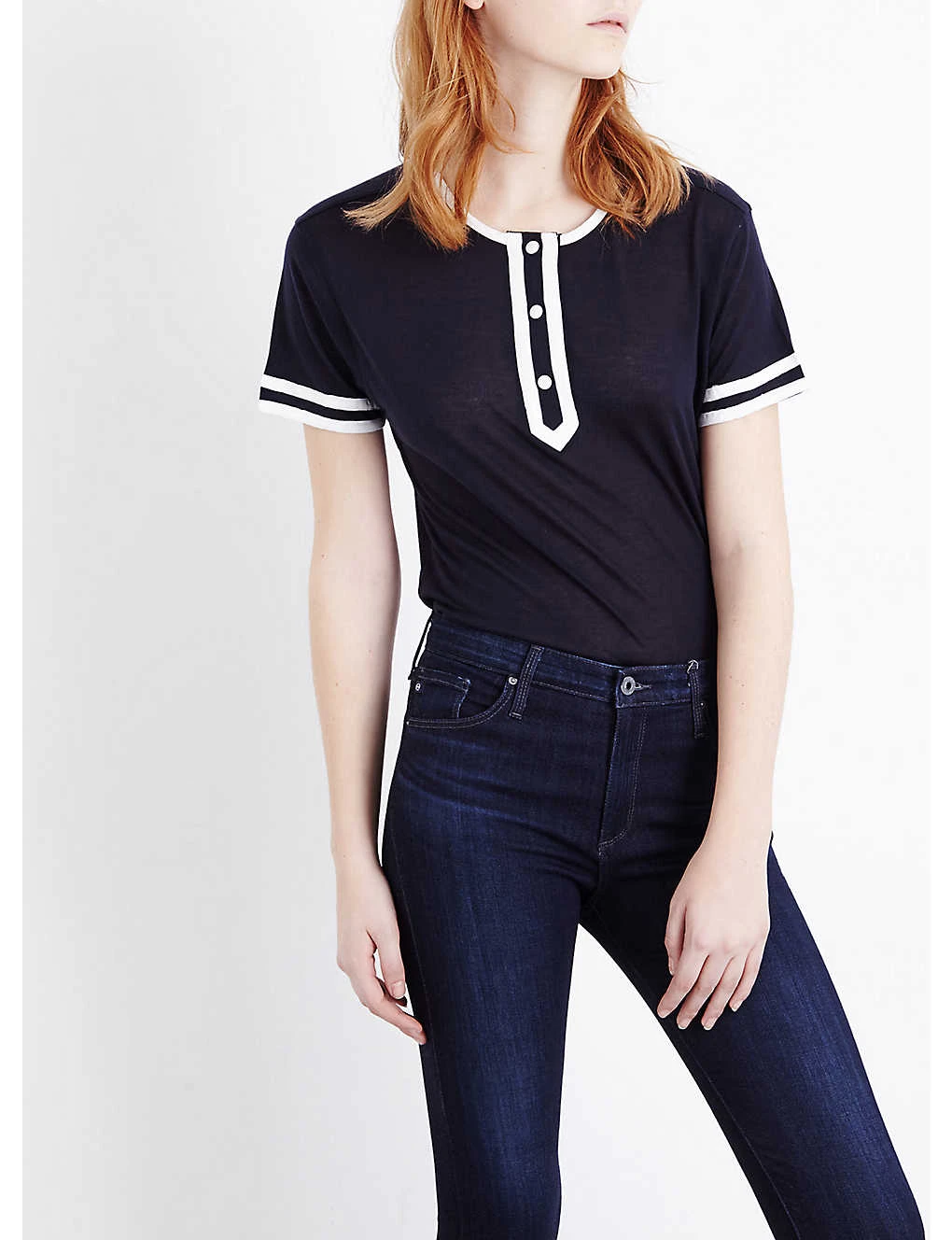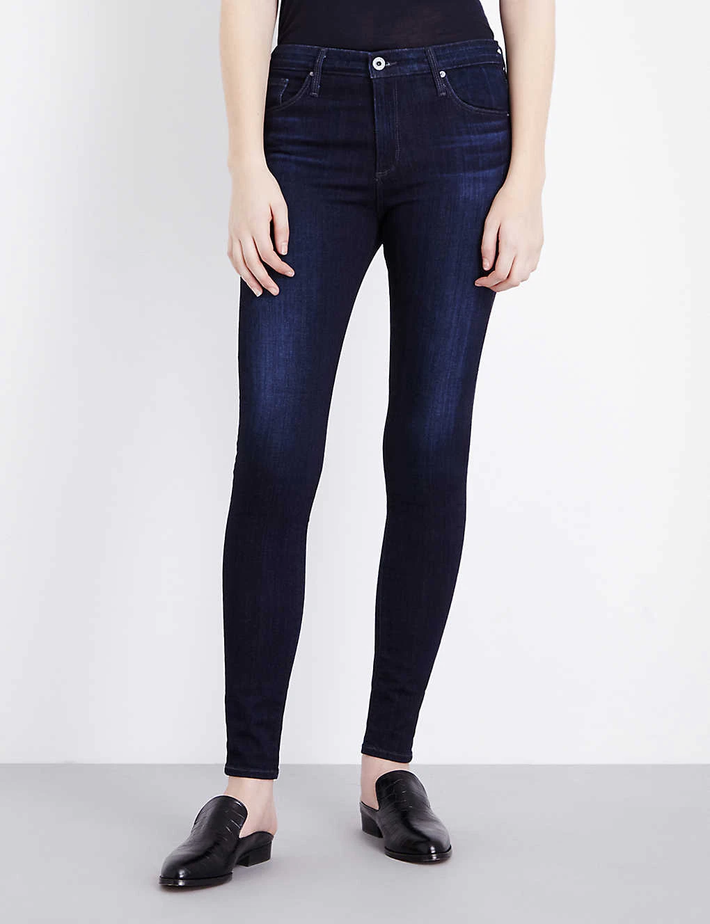 AG Jeans stretch-denim jeans Exposed button and concealed zip-fly fastening at front Skinny, high-rise, belt loops, five pockets, branded hardware, contrast stitching, indigo-wash, whiskering at front, fading at front, brand patch at back waistband, stitched detail at back pocket, v-shaped yoke at back 58% rayon, 21% cotton, 20% polyester, 1% elastane Machine wash True to size Size 26: Rise 10″”, inside leg 31″”, leg opening 10″” Model is 5ft 10″” and wears a size 26 Made in USA