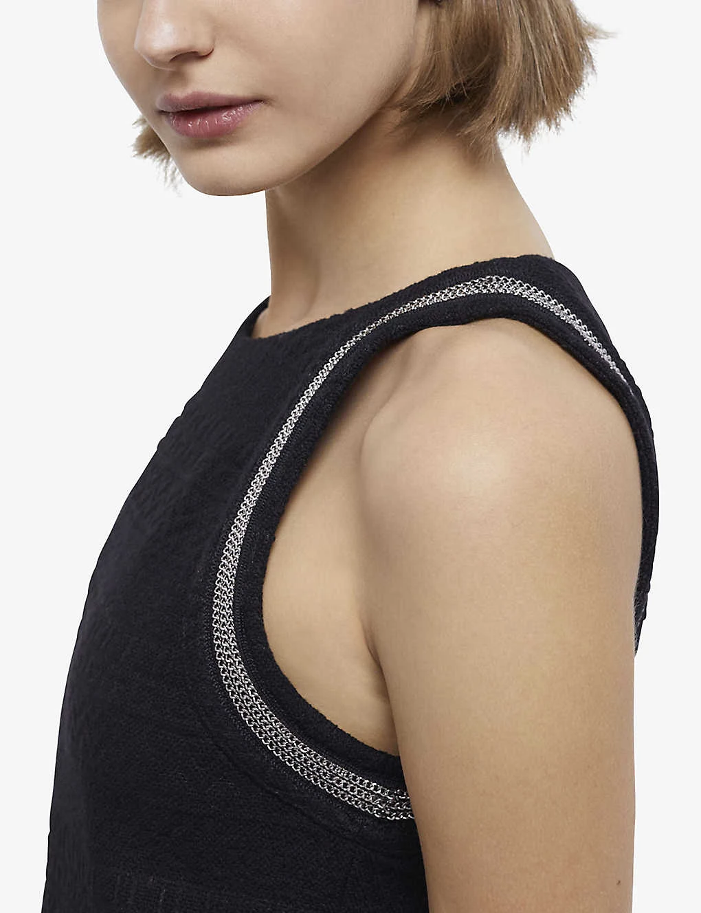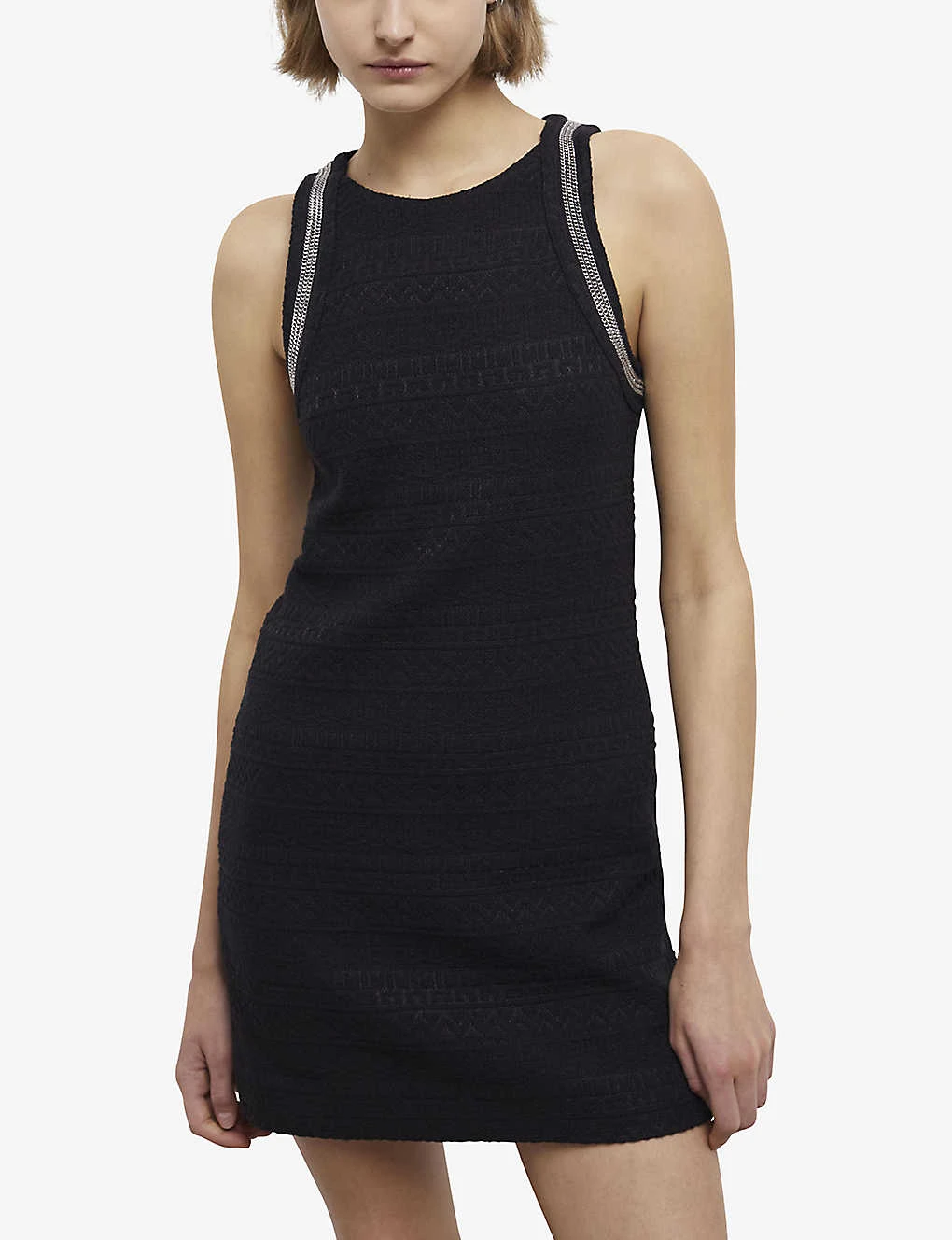 - Round neck, sleeveless, chain trim at the arm holes, all-over textured knit, mini length