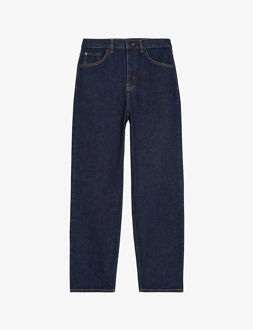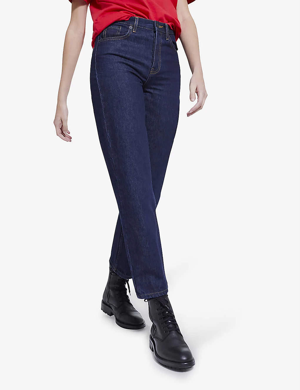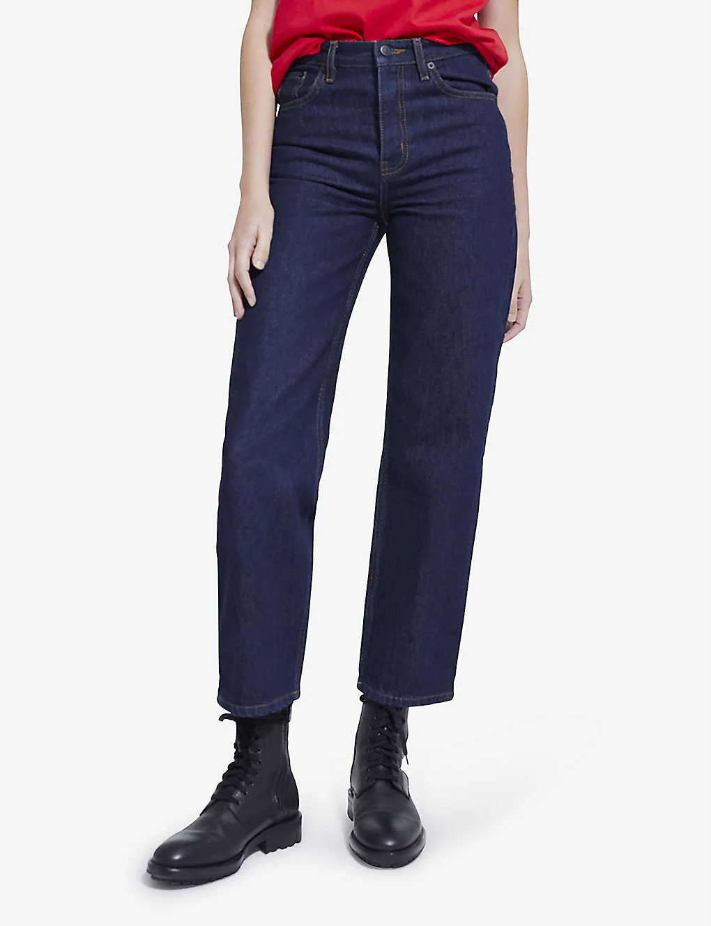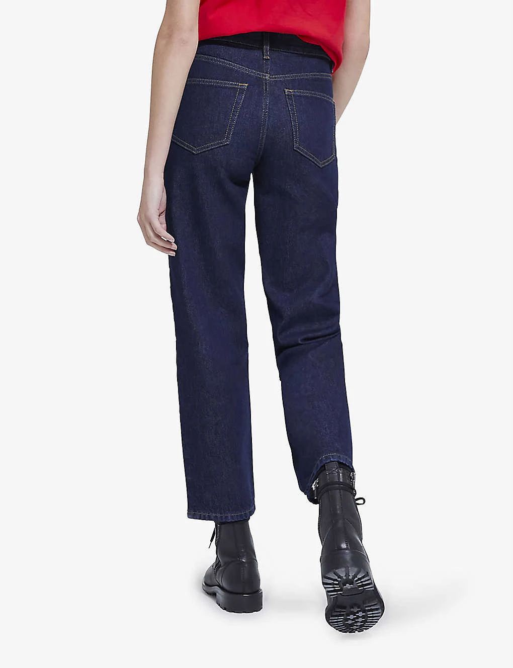 - Straight-leg, high-rise, belt loops, contrast stitching, five pockets, branded silver-toned hardware