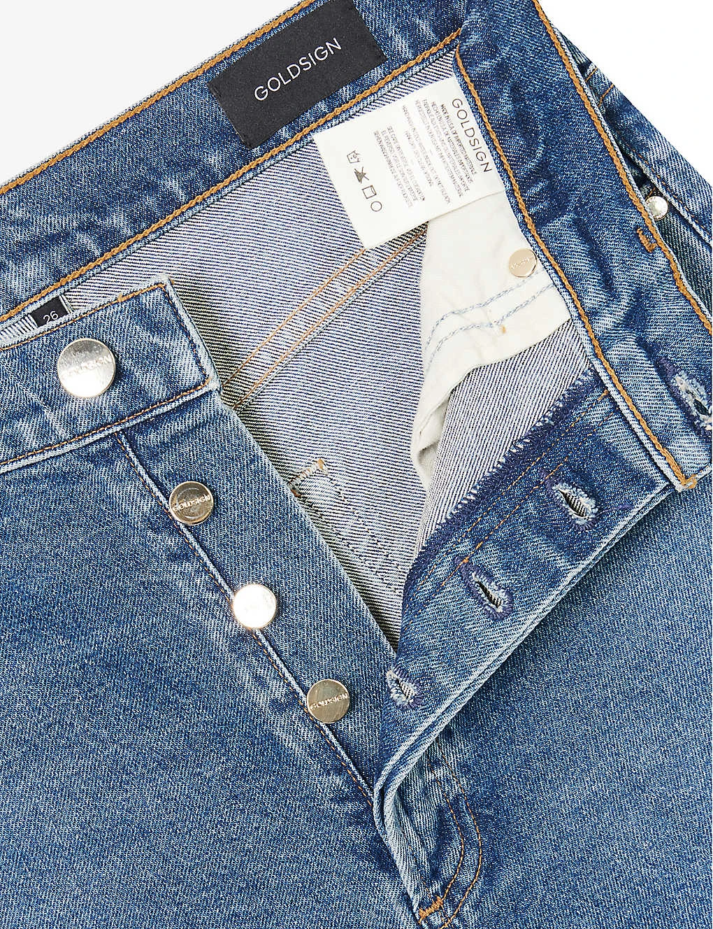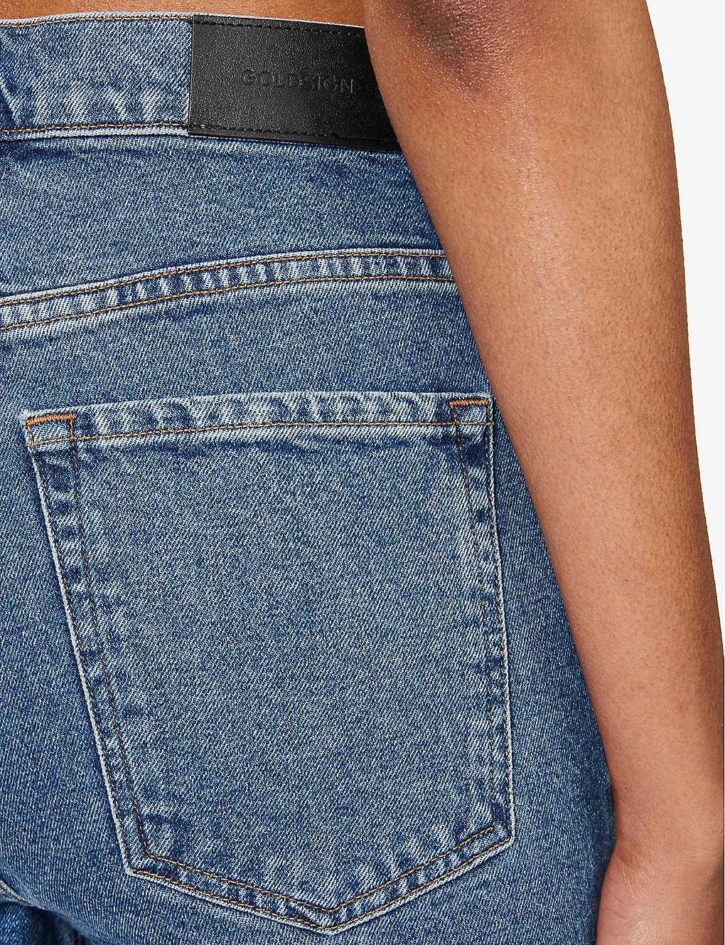 - Slim fit, high rise, tapered leg, belt loops, five pockets, brand patch at back, contrast stitching, branded hardware, partially lined