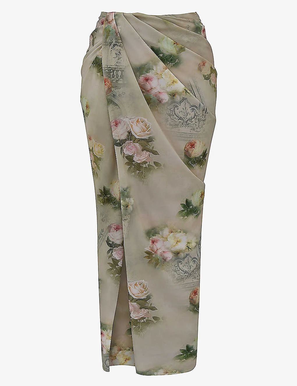 - Draped front, high split at front, all-over floral print, fully lined