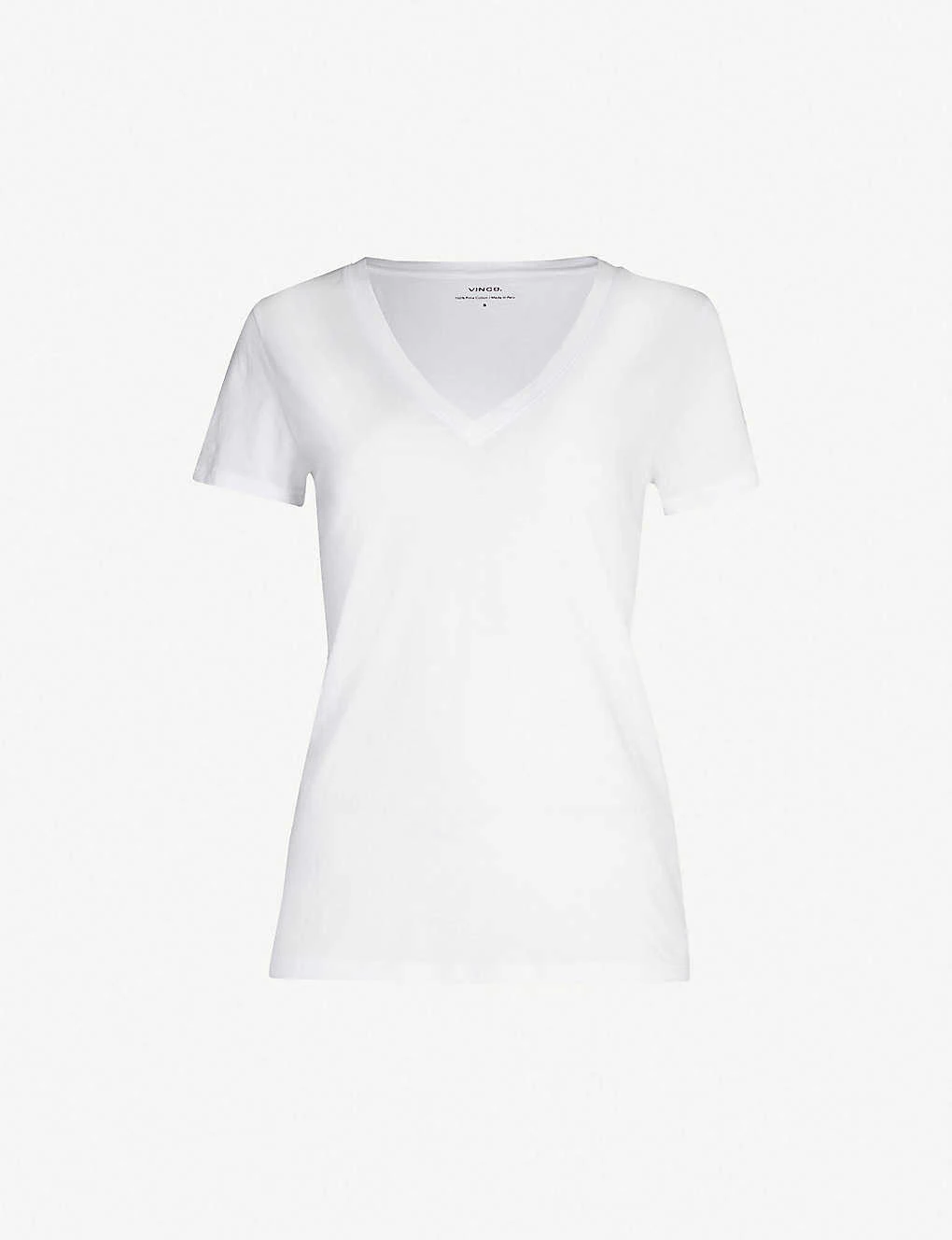 Vince cotton-jersey T-shirt Slips on V-neck, short sleeves, tonal stitching, straight hem 100% pima cotton Machine wash True to size Size small: Length 24″” Model is 5ft 10″” and wears a size small
