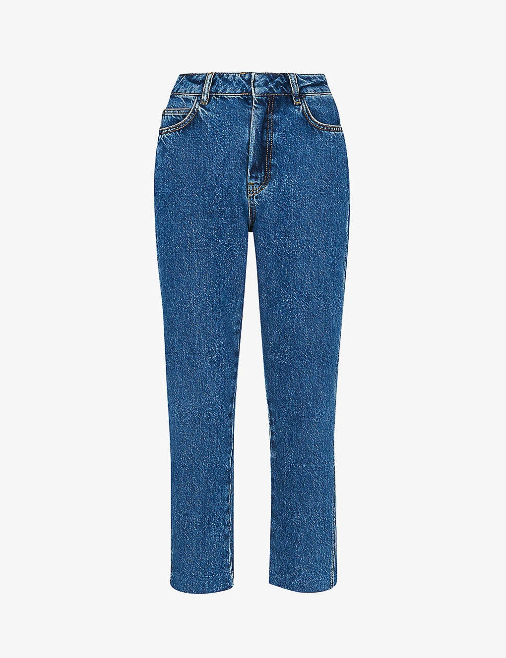 - Regular-fit, high-rise, slim leg, belt loops, five pockets, all-over faded wash and whiskering, cropped, partially lined