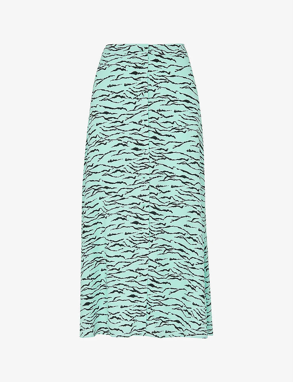 - Midi length, button-through front, high-waisted silhouette, all-over tiger print, fabric-covered buttons, straight cut, fully lined