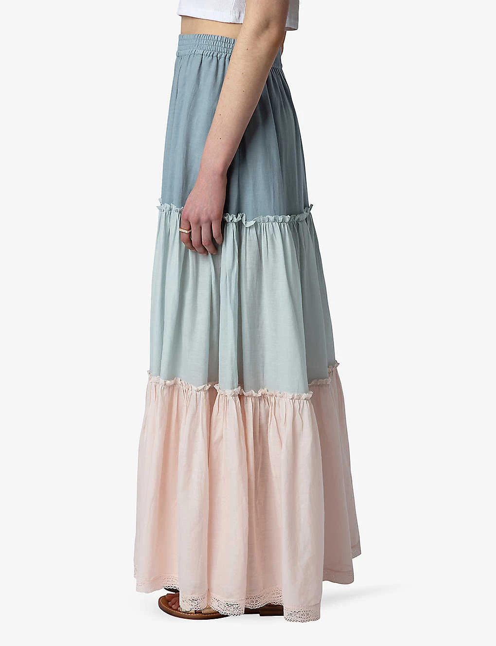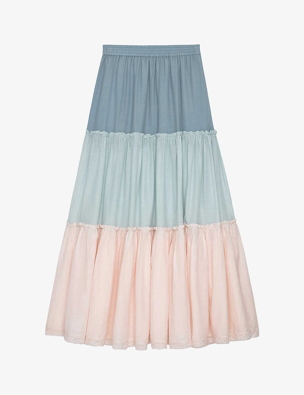 - High-rise, tiered-detail, lace-trim at the hem, elasticated waist, maxi length