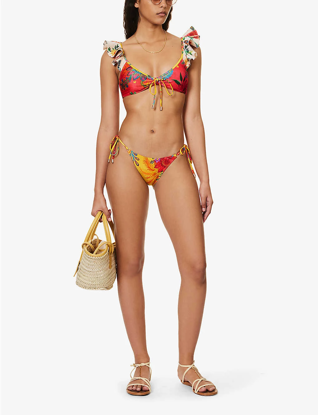 Zimmermann bikini set80% polyamide, 20% elastaneClasp fasteningTop:Adjustable straps, soft triangle cups, removeable padding, ruffles, gold-toned hardware, all-over graphic printBottoms:Mid-rise, elasticated waistband, gold-toned hardware, all-over graphic print, mid-coverage at back, fully linedHand washTrue to sizeModel is 5ft 10in/1.78m and wears a size smallLightweight, stretchy